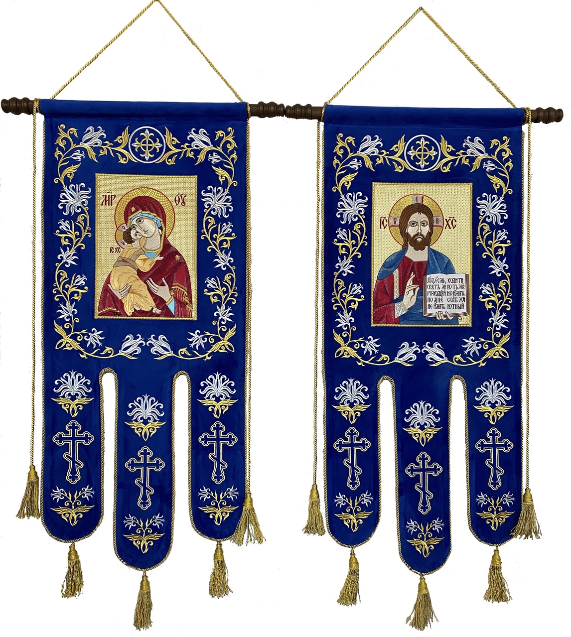 Хоругви. 100% вышивка!!! Цена за пару!!! Иконы полностью вышитые. Машинная вышивка. Авторский дизайн. Орнамент -машинная вышивка на бархате или безворсовой ткани(на выбор) МЕТАЛЛИКОМ.